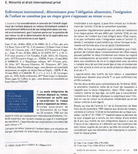 Retrouvez l’intégralité de l’article sur l’Enlèvement international : déterminante pour l’obligation alimentaire, l’intégration de l’enfant ne constitue pas un risque grave s’opposant au retour » co-rédigé avec Maître Bérangère DIOT dans la Gazette du Palais, n°24, pp.53 et 54