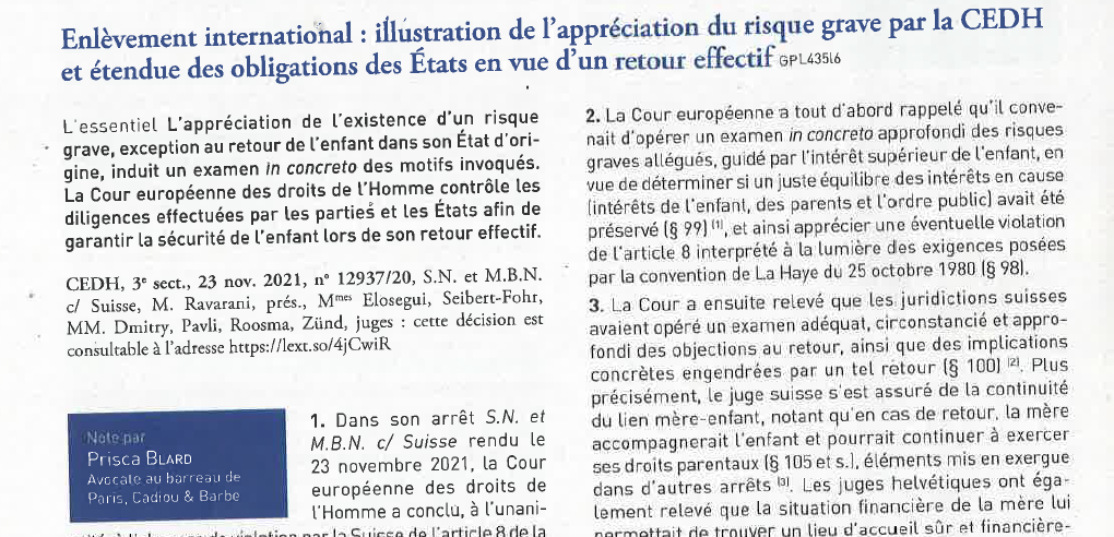 Voici une nouvelle illustration de l’interprétation de la notion de risque grave par la Cour européenne des droits de l’homme en matière d’enlèvement international et ses conséquences pour les Etats membres.