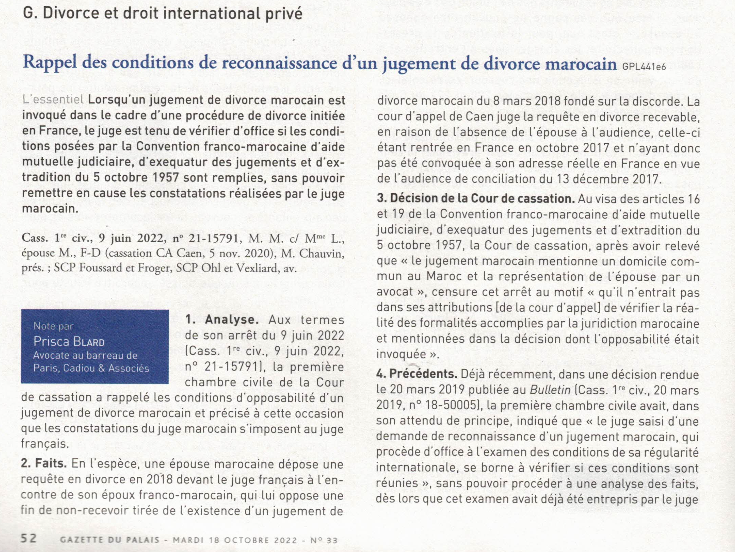 Retrouvez l’intégralité de l’article sur le ” Rappel des conditions de reconnaissance d’un jugement de divorce marocain” dans la Gazette du Palais d’octobre 2022, pages 52 et 53